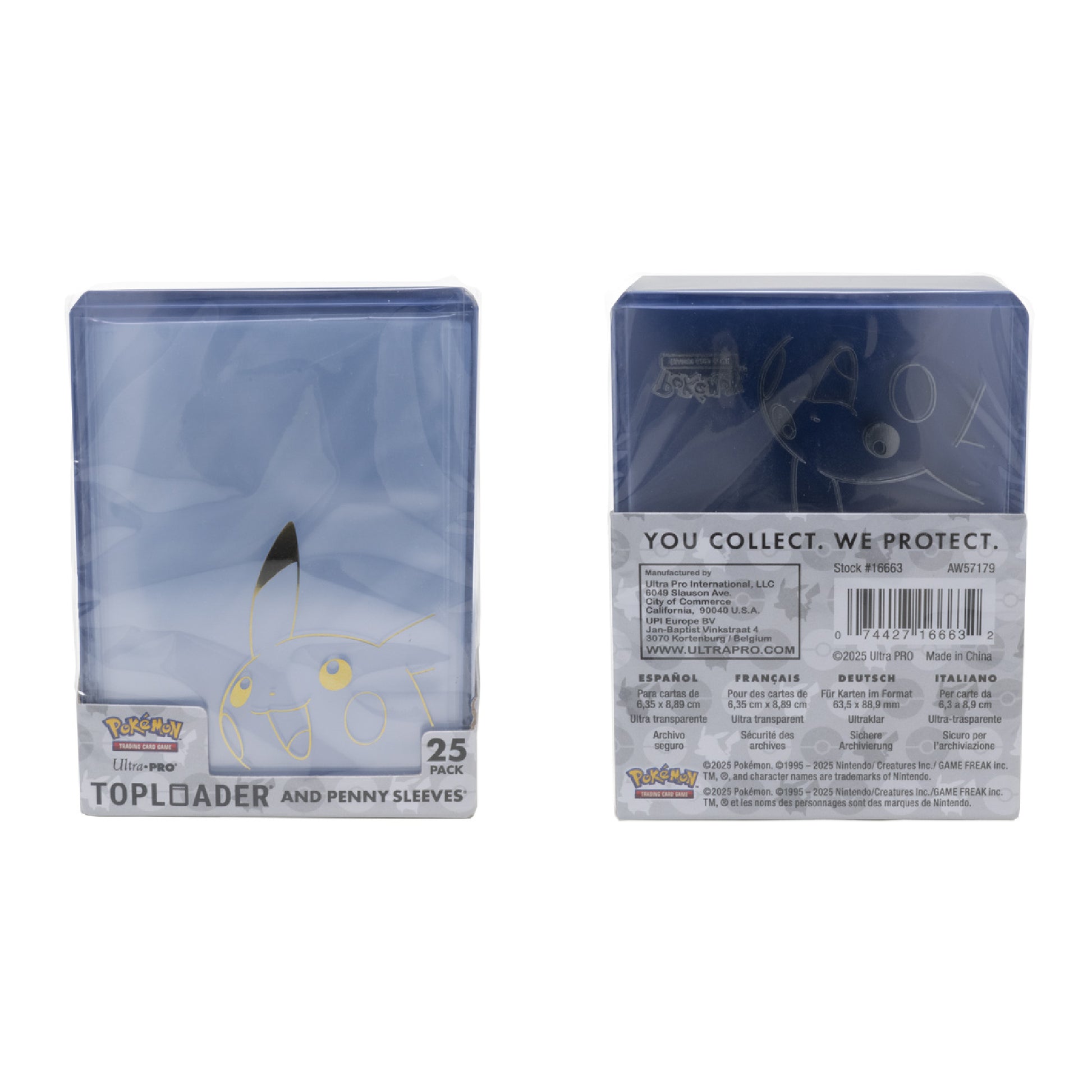 The Pikachu Toploader® and Penny Sleeve® Combo Pack protects your valuable Pokémon Trading Card Game collection with a stunning foil effect. The Ultra•PRO Toploader® is a rigid card protector made from ultra-clear PVC to keep your cards safe for storage, display, trades, and shipments. With outer dimensions of 3″ × 4″, these Toploaders are designed to safely store standard size cards (2-1/2″ × 3-1/2″) up to 35 points thick.